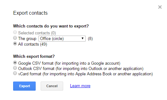 Step 4: You will get the pop-up to choose the contacts you want to export and the format of the file which will be exported. You can choose from Google CSV format, Outlook CSV format, and vCard format.