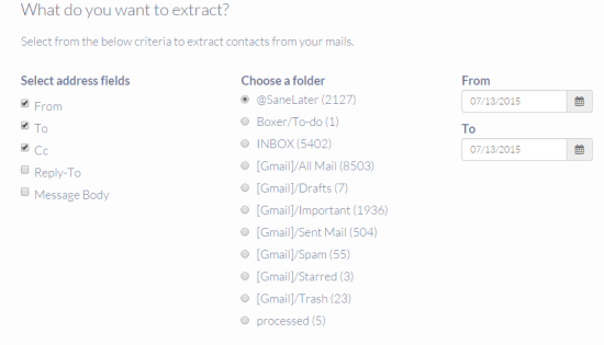 Step 3: Choose the address fields, folder, and date range for extracting the email addresses. For each of the fields and folders, the app also shows the count of email addresses available. Click on Submit button once you’ve chosen the fields.