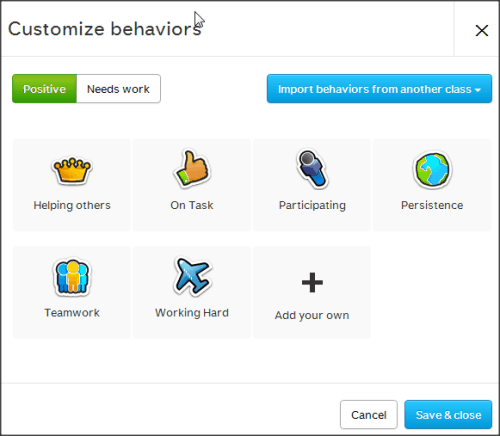 - You might find this step interesting. Here, you can choose the behaviors for which you will grant point to the students. By default, it offers six behaviors in each category: positive and negative (Need Help), like: Helping Others, On Task, Teamwork, Late Homework, etc. You can also add your own behaviors to the class, as well. First choose the category: “Positive” or “Needs Work”, and then click on “Add your own”. Now, select the icon, and name of the behavior, and click on “Save”.