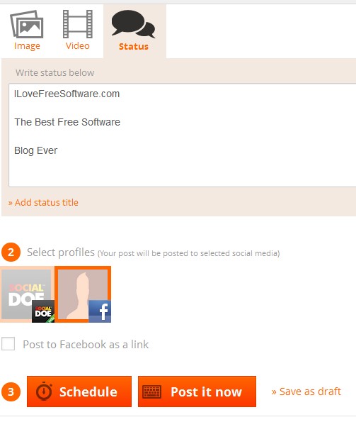 Open up the created web page, and from the left sidebar select Create New Post. They can either be image, video or status (text oriented). When you’re done with the setup, click Post it now or schedule, if you would like to schedule the post.