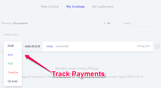 Billdogg is a free and simple online invoice maker to create, send, and download invoices. Using this invoice maker, you can easily create simple and beautiful invoices in a flash and send them to your customers via unique URL or email. You can also use it to track payments by assigning different “Payment Status” to invoices including Draft, Sent, Paid, Overdue, and On Hold. If you want to keep the invoices for later use, then you can either download them as PDF files or save them online in your Billdogg account.