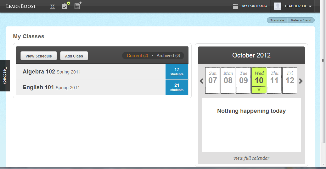 • Teacher– Like students, teachers can plan their calendar too. However, teachers get many more useful features than parents or students. This is quite reasonable as teachers have more number of tasks than parents or students and therefore, they require more features to efficiently manage them.Teachers can view their classes subject-wise with respective number of students for each of them. General information, roster, seating arrangement, schedule, and accessibility can be administered for each class. Besides, a teacher can maintain a detailed Gradebook for each class where information regarding all types of assessments can be displayed. All the results are maintained in various forms of graphical representations such as bars, charts, graphs, etc. There is also a very efficient attendance table to capture students’ punctuality.In addition to these, the settings of all the features can be changed according to personal preferences. This makes the layout personalised and makes working on LearnBoost interesting. A separate page allows maintenance and descriptions of all the lessons of both past and future. In this page there are separate sheets to track general information, maintain standards, edit lessons, create materials for lessons, capture evaluation results and add external media URLs for support during a particular lesson.