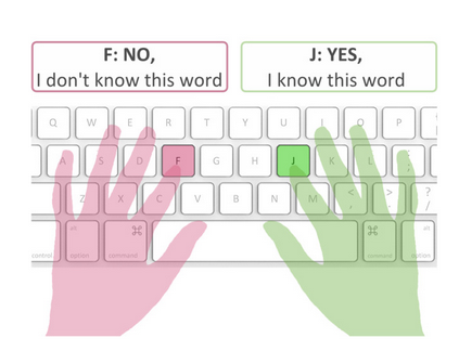 After providing the details, you can start taking the test. During the test, you will be shown a word in American English spelling. You’ve to answer whether you know the word or not. You’ve to press key F if you don’t and key J if you do. When you’re ready to start the test, press Spacebar.