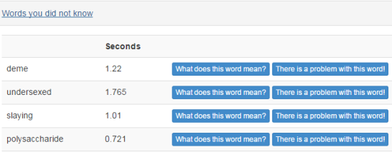Apart from this, there is also the breakdown of all the words into 4 categories which were shown to you during the test. These categories are: Words you didn’t know, Nonwords you responded YES to, Words you knew, and Nonwords you responded NO to.