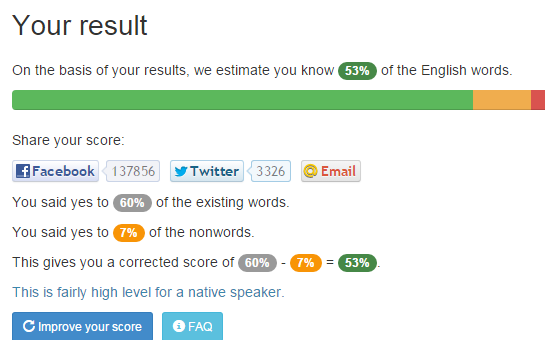 Once the test is over, the website will automatically display the results. It will show you the overall % of English words you know along with % of existing words you said Yes to and % of non-words you said Yes to.