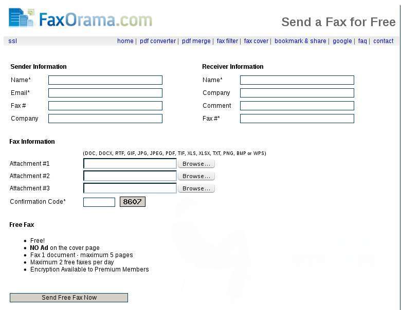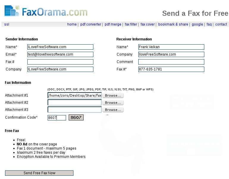 Fax setup interface, where you’re gonna be setting up the faxes that you decide to send, can be seen in the image above. There’s no need to register, but you’re gonna have to enter your email and confirm that you’re really human before the fax is gonna be sent. Sender and Receiver sections are where email, fax number, sender and receiver names are written. Notice the three Attachment fields down below, that’s where you can attach the documents that you want to send as a fax.