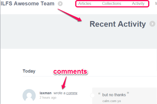 On your team page, you can check recent activities, articles (or links) shared by you and team members, collections (of folders) in which links are added.