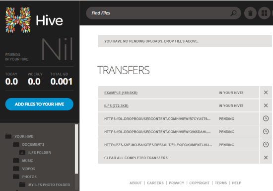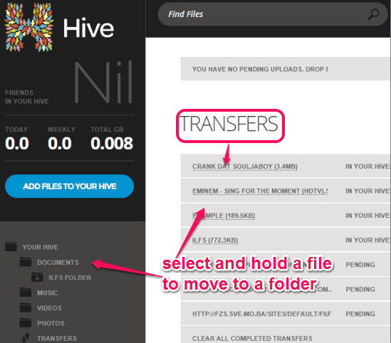 All uploaded files are added to TRANSFERS folder from where you can move files to required folder. In above screenshot, you can see all the transfers done by me to my Hive account.