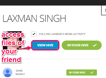 You can share your file with anyone who is your friend on Hive. All public files can be viewed and downloaded by your Hive friends and vice-versa. You first need to accept or send friend request to your friends. You can also invite your friends by sending them email invitation.