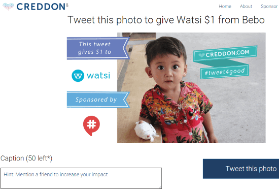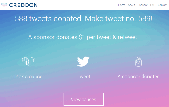 Creddon (beta) is a free website that lets you donate tweets for raising the funds for charities. No, you don’t have to donate your own tweets, favorites, or retweets. This website lets you choose a cause from its homepage that you can post as a tweet on your Twitter timeline. And for each tweet, the sponsors will donate $1 to associated charities. Every single retweet made by users from your account is contributed as ¢50.
