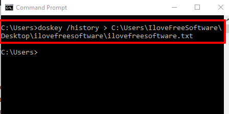 To save your Command Prompt history, you need to enter doskey /history > “path of output folder or location” “filename with file extension“. So the full command would be like: doskey /history > outputlocation\outputfilename.txt.