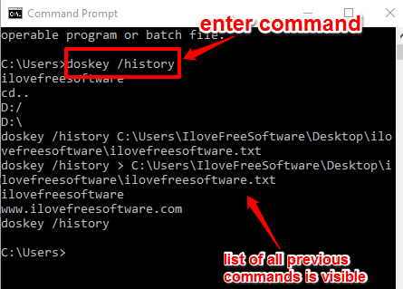 Step 3: If you don’t want to see commands in a pop-up, then simply enter “doskey /history” command and press Enter key. It will show the list of all commands within CMD window.