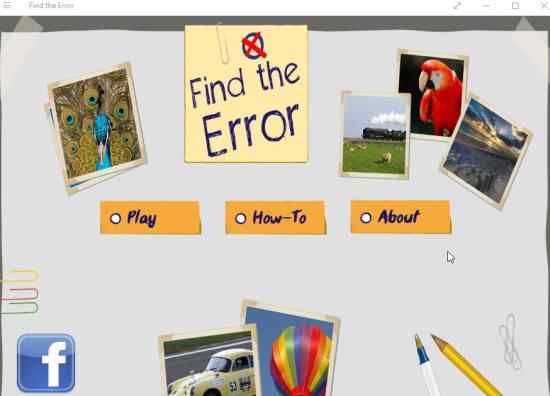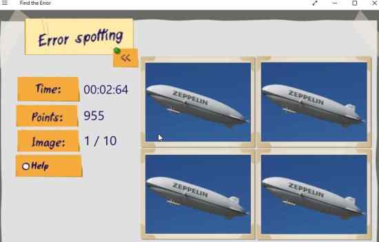 Find the Error is a free Windows 10 find the difference game app where you will be shown four similar images and one of them has some error, which you have to find as quickly as possible. The regular find the difference games usually have 2 images to find the error from. But this game app gives you 4 same images, with one of them having one or more errors.