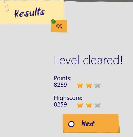 The level up screen looks like the screenshot above. Where you are shown your score as well as the highest score you have reached so far. The next button will take you to the next level.