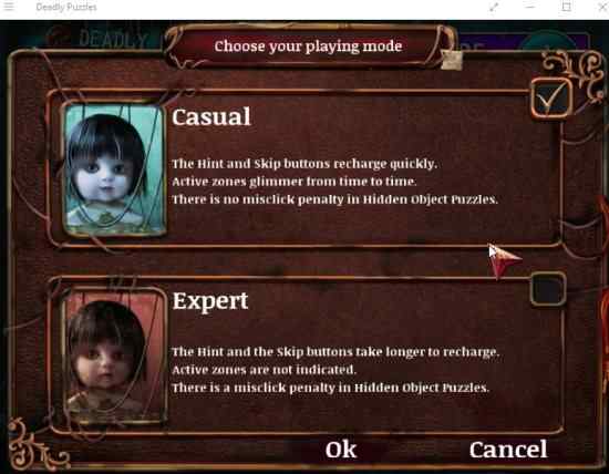 If you choose the casual mode, you will be given hints, active game areas will glimmer and there would be no penalty for wrong clicks. Whereas in expert mode the hints button takes a long time to recharge, there would be no active zones highlighted and there would be penalty for wrong clicks.