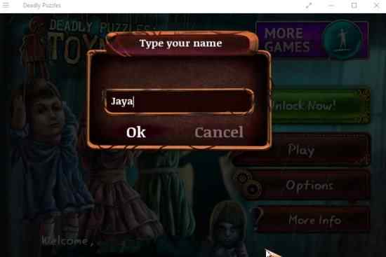 The Windows 10 hidden objects puzzle game app can be downloaded from the Windows 10 store or from the link given at the end of this article. When you start the game app, you will first be asked for a name to play the role of the detective. This can be seen in the screenshot below.