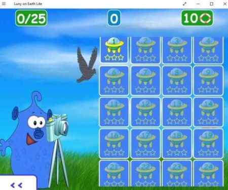 The Windows 10 memory game app can be downloaded from the Windows 10 store or from the link given at the end of this article. There is a story with this game app. Luny is a alien who has come to earth to take pictures of the beautiful earth animals, birds, plants, etc. Now he can only go home once he is able to find all the photos that he clicked in pairs. You have to help him find pairs of photos. When you start this app for the first time, you will see a screen like the one shown in the screenshot below.