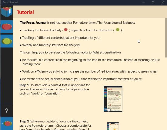 Focus Journal is a free Windows 10 Pomodoro timer app which helps you focus on tasks that are important. The app helps you to improve your efficiency through pomodoro timers. You get red and green tomatoes each time the timer runs. Red tomatoes means good focus and green tomatoes means you were distracted.
