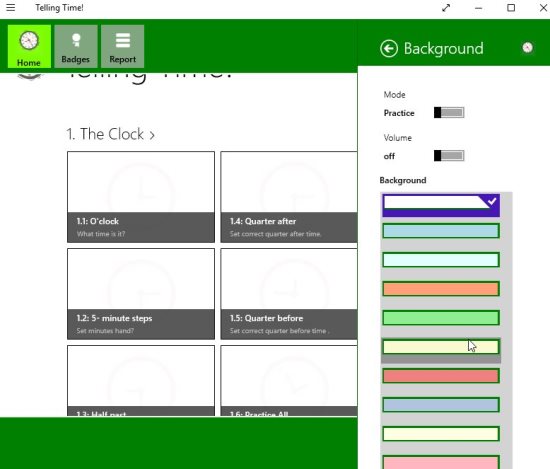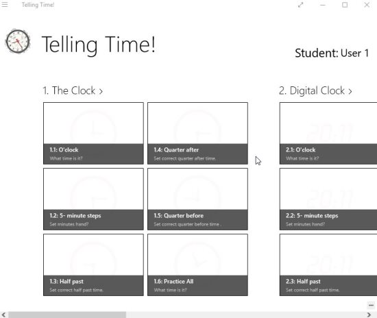 Telling Time! is a free Windows 10 time learning app for kids where kids can learn how to tell time in a interactive way. The app gives you various clock options like digital clock, analog clock, roman clock, etc. Any clock you pick is further divided in to categories like O’ Clock, quarter after, quarter before, etc.
