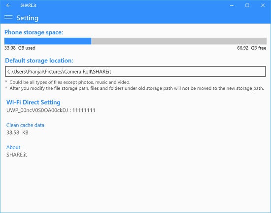 In the above screenshot, you can see that you can configure various settings of the SHARE.it app, including storage location, cleaning cache etc. You can also have a look at the available storage space, etc.