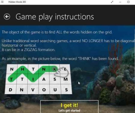 Hidden Words 365 is a free Windows 10 word search game app where you have to search words in a grid. The apps lets you search words in a grid unlike the traditional word search games. Instead of vertical, or horizontal word searches this apps allows you to search words in a zigzag formation.