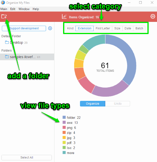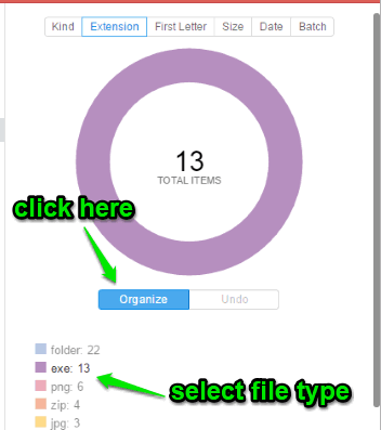 On the interface of this software, you can first add a folder and then it will show how many files and folders are available in that parent folder. A beautiful pie chart is also visible for that. Once the folder is added, you can use preset categories like type, extension, first letter, size, date, etc. Selecting a particular category will show which type of files are available. Finally, you can select a file type and then organize all of those files in one click.