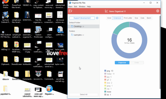 Here is a free software to automatically organize files based on their extensions, size, type, date, etc. The name of this software is “Organize My Files“. Let’s say you want to organize PNG images available on your desktop. This software automatically shows total number of PNG images present on your desktop. After that, you can select PNG file type on its interface and then automatically move all of those images in a PNG folder. The folder is created by the software automatically. Thus, in just a single click, it will clean your messy desktop. Similarly, you can move and organize other files by their size, type, date, etc. You can also undo changes anytime using its interface.