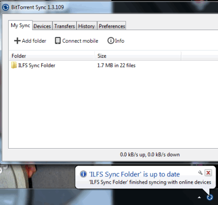 In screenshot above, you can see it provides notification whenever sync is completed with all online devices (that are running BitTorrent Sync). Whenever a new file is added or any file is deleted from sync folder, it automatically updates other devices.
