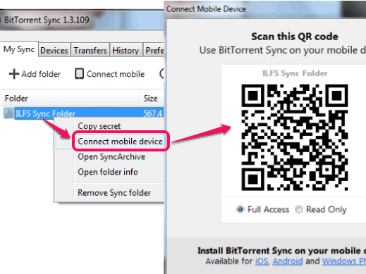 Step 1: On its PC client interface, right-click on sync folder, and click on Connect mobile device option. This will provide a QR code that will help to connect your phone with your PC. In QR code, it also lets you set permission (full access or read only) for sync folder. You can also create other folders than main sync folder, but in my testing, sync failed with other folders. So you should move main sync folder only.
