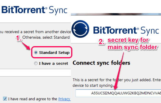 Step 1: Install BitTorrent Sync on your PC by following the Standard Setup process. This will let you select your main sync folder. You can either choose existing folder or generate a new folder. A secret sharing key for that folder will also be generated during installation process.