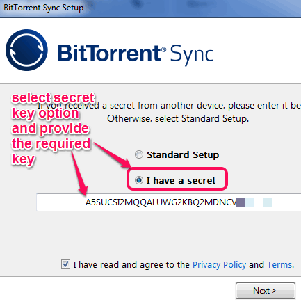Step 2: After setting up sync folder, you can add multiple folders inside that folder. Now keep running BitTorrent Sync on your PC and let your friend(s) start installing BitTorrent Sync to their PCs. During the installation process, your friend(s) need to select ‘I have a secret‘ option. Also, they have to add the same secret key that was generated for your sync folder. Then only sync process will take place.