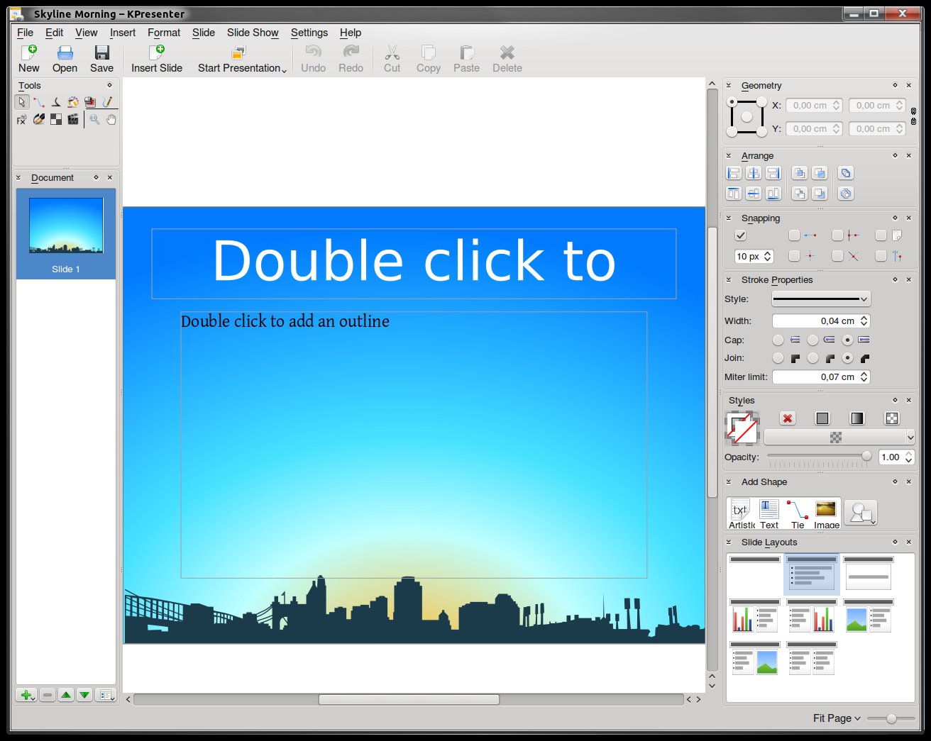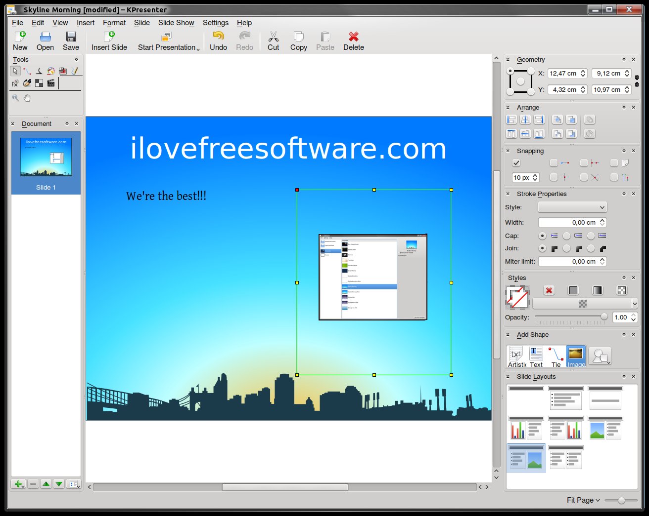 Beautiful presentations can be made with KPresenter, you just need to get used to the way things are done in it, but the good thing is that the interface is much more similar to other presentation programs like Power Point, so you won’t have a long period of getting used to KPresenter.