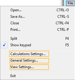 Now lets talk about the features of the Tabs present at the top the Window. The File tab has options which allows you to save and print the whole calculations done as a single file. The ‘Calculation Settings…’ allows to set the number of digits after the decimal point during calculations and during result round off. The ‘General Settings…’ provides various settings regarding keyboard and calculator window.