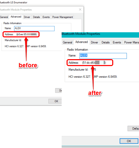 bluetooth MAC address before and after