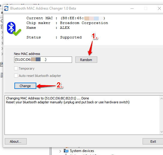 The software is in beta currently, but can successfully change your Bluetooth MAC address. Also, note that it supports Bluetooth adapters of Broadcom Corporation and Cambridge Silicon Radio vendors. So, if the software supports your Bluetooth adapter, it will help you change the MAC address.