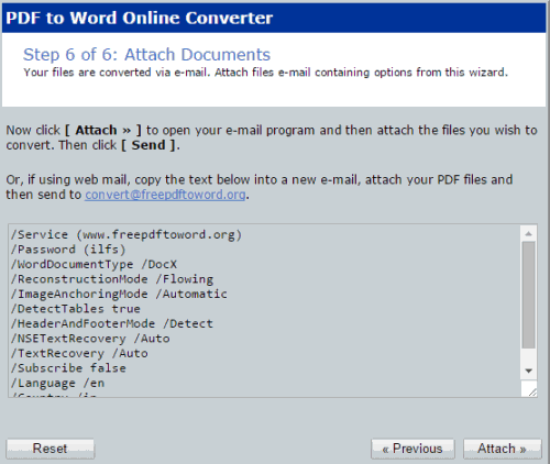 Step 6: This step is used to attach your PDF files for conversion. You can also see all the settings for output files set by you in a box. Use Attach button to open your email account, compose a new mail with attached PDF files, and send to [email protected].