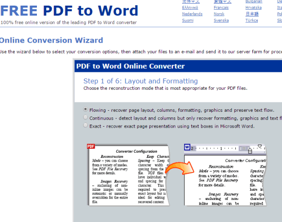 Open the homepage of this website using this link. After this, you need to follow a wizard which contains some easy steps to convert multiple PDF files to Word files without any sign up. You can also preview a sample in each individual step which will give you a good idea for applied settings. Steps are as follows: