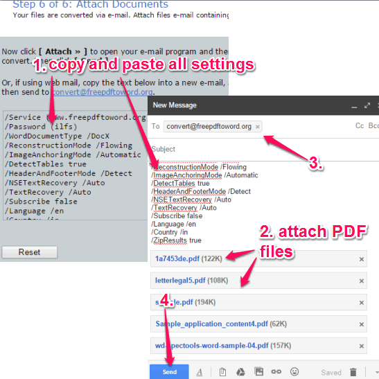 PDF to Word Online Converter is a great tool using which you can automatically convert multiple PDF files (attached in an email) to *.docx (or *.rtf) files. All you need to do is perform some simple steps to apply output settings and compose a new mail with your attached PDF files. In return, you will get Word files in your Inbox in just a few seconds.