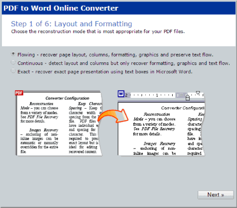• Flowing: To recover the page layout, text flow, columns, graphics, etc., and