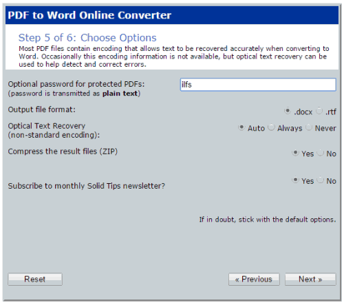 Step 5: This is a very important step. In this step, you can set a couple of settings, such as: set output format (DOCX or RTF), enter password (if input files have any), get output in ZIP, and enable/disable option to receive newsletters from this website.