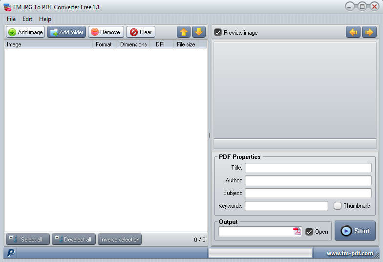 Interface of this free JPG to PDF converter utility can be seen on the image above. It’s very compact, neat, and easy to follow. On the left there’s the file list area where selected images are gonna open. Above that we have buttons used for selecting and removing files from the list. On the right side you have the image preview area, and you can also enter important PDF document properties, title, author, subject, and so on.