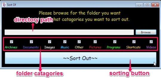 The Directory Path is a text box which shows the path of the folder whose contents are to be sorted out. To add a folder for sorting click on Browse button. After adding the folder, you can choose requisite categories from the folder categories check list and specify which file types you want to organize. Then click on Sort Out button. A folder for each category (that you have checked on) will get created and there you’ll have your files sorted. Sorting is as simple as that!