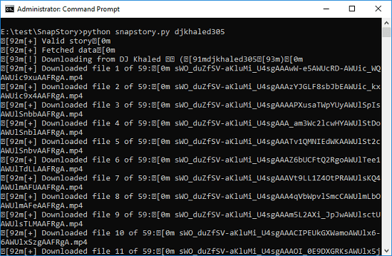 Now, at this time, you are ready to use SnapStory to download public Snapchat stories. To download the stories, you just have to run the following command in the command prompt. After that, it will start downloading all public stories of that Snapchat user and you can see the details. It creates a separate folder for each user whose Snapchat stories you have downloaded.