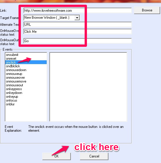 Then a new dialogue box will open, where you need to enter the link, target frame, alternate text, on mouse over text, on mouse out text, and events; as shown in the below screenshot: