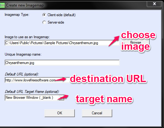 Then choose the image, and provide default destination URL and default target frame. Default target frame can be selected from the given drop down menu. Destination URL and target frame are optional.