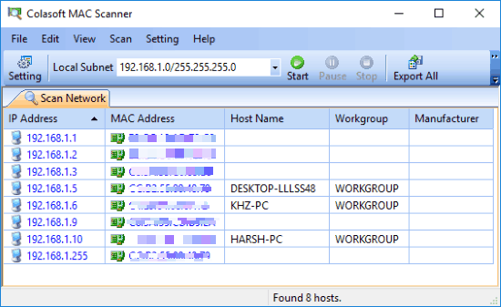 Colasoft MAC Scanner is a free network scanner software for Windows. It can scan all the ports of your local network for connected devices. It can provides you the details such as: IP Address, MAC Address, Host Name, Workgroup, and Manufacturer.
