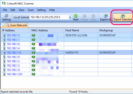 Once the scanning is complete, you can export the list of connected devices. You can export the list in .TXT, or .CSV format, and also in its native .CSCNTAB (Colasoft Name Table File).