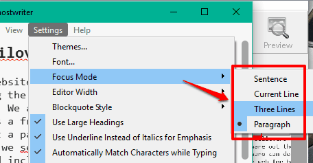 You can also enable its focus mode which is very interesting. Focus mode lets you keep your concentration on the current line, three lines, or a paragraph. Rest of the content remains fade, which lets you concentrate only on the line or content that you want to focus.