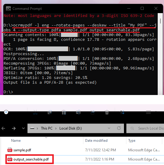 - Run the main OCRmyPDF command like this and then wait for a few seconds. It will save the final PDF file in the same directory with the name “output_searchable.pdf”.