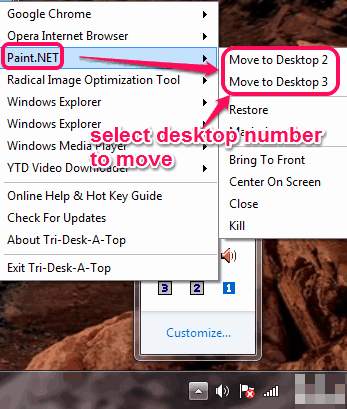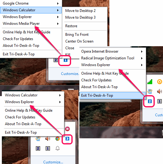 After executing this free virtual desktop software, it will run in the system tray. Accessing the system tray icon will show you 1, 2, and 3 numbers that actually indicate the 3 virtual desktops provided by this software.